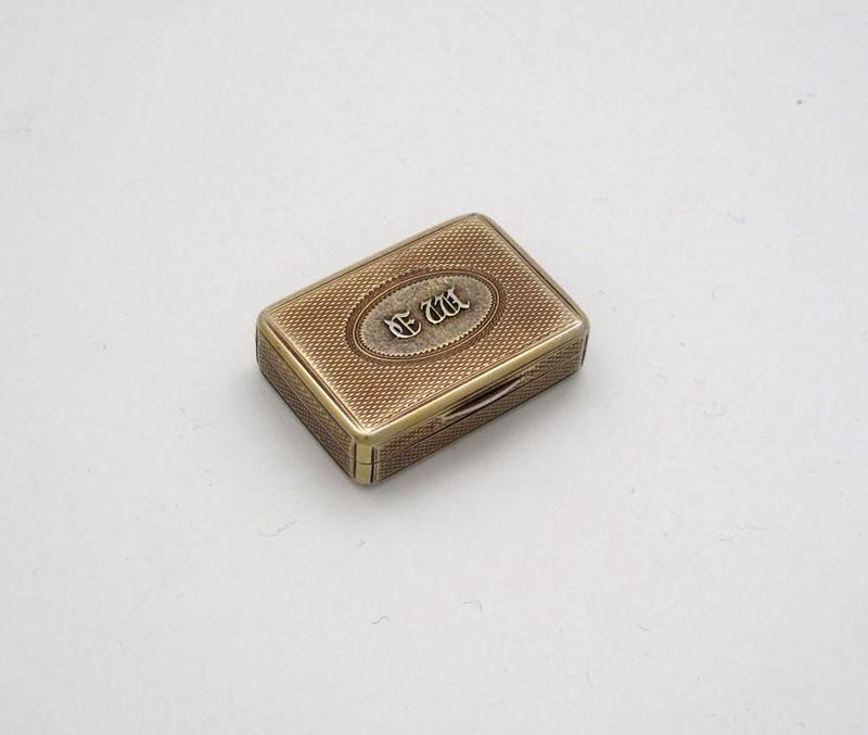 rectangular form, engine turned decoration, applied with a monogram, length 4.3cm, approx. weight 1oz.