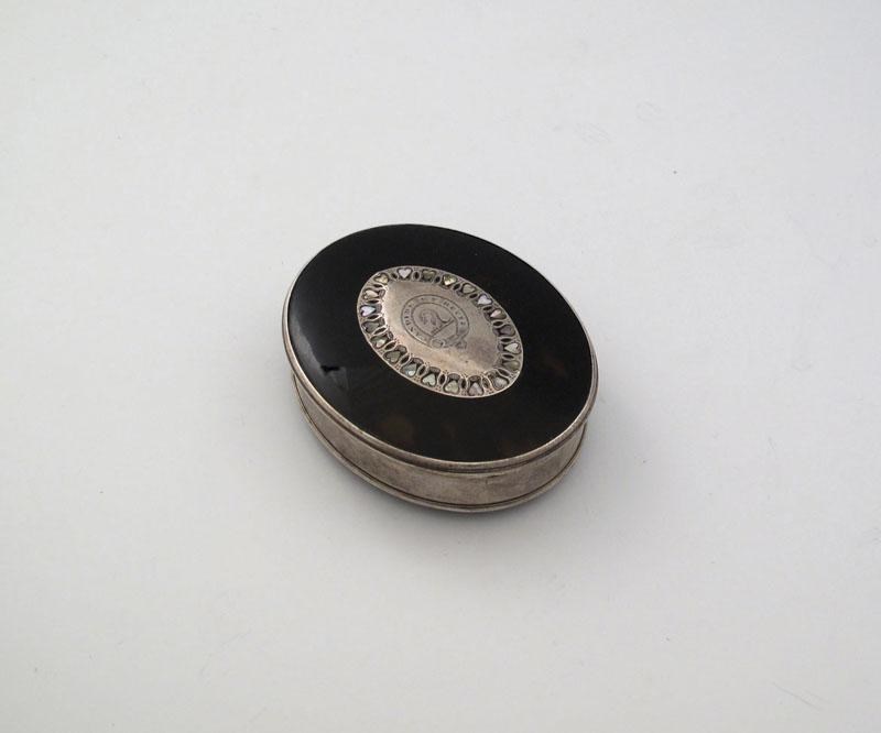 oval form, the pull off cover with an oval plaque inlaid with mother-of-pearl hearts, and engraved with a crest and motto, length 10cm.