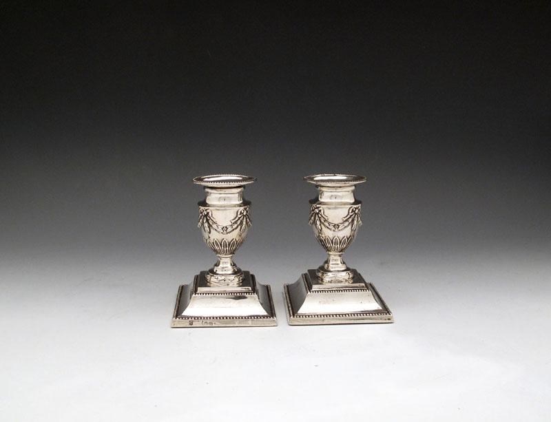 urn shaped capitals with ribbon tied swag decoration, beaded borders, on raised square bases, height 10.8cm. (2)