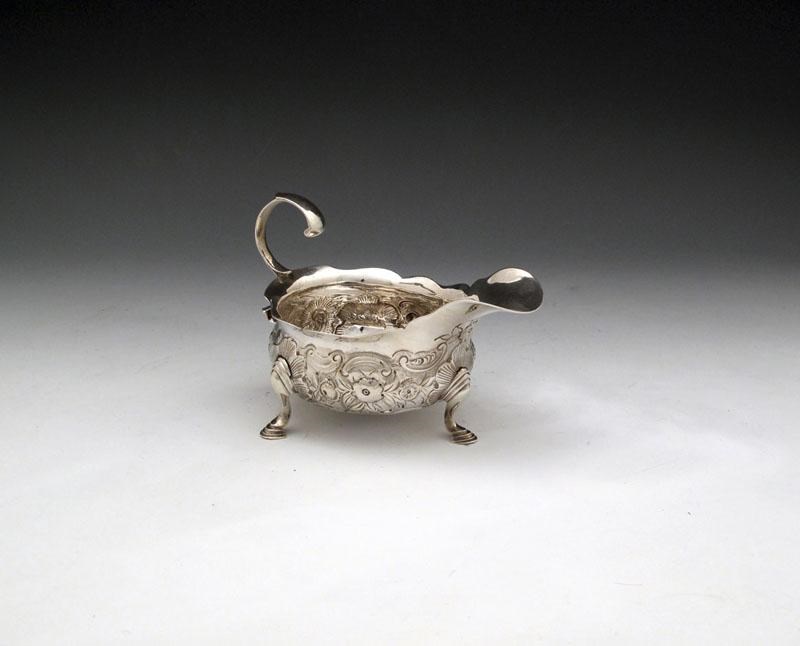 oval form, embossed foliate decoration, scroll handle, shell capped hoof feet, length 14cm, approx. weight 5oz.