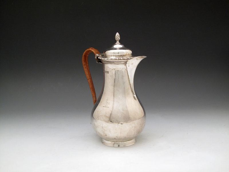 baluster form, wicker bound scroll handle, gadroon border, flame finial, engraved with a crest, height 20cm, approx. weight 14oz.