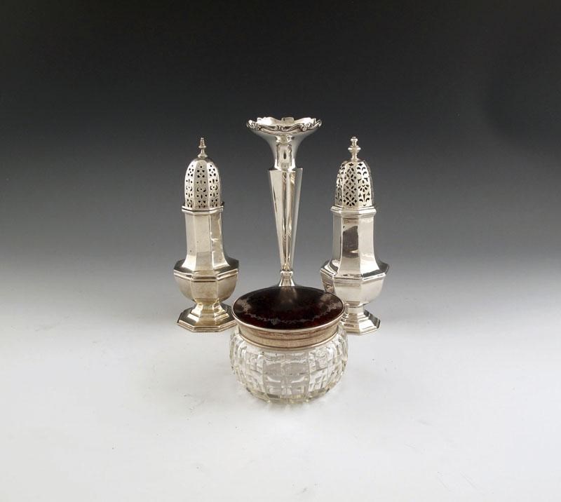 comprising: two similar sugar casters of octagonal baluster form, a trumpet vase and a silver and tortoiseshell mounted powder jar, approx. weighable 7oz. (4)