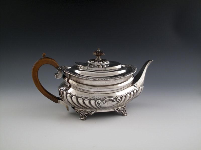 oblong bellied form, part fluted decoration, reeded scroll handle, flush hinged cover, the whole on four bracket feet, length 28.8cm, approx. weight 28oz.