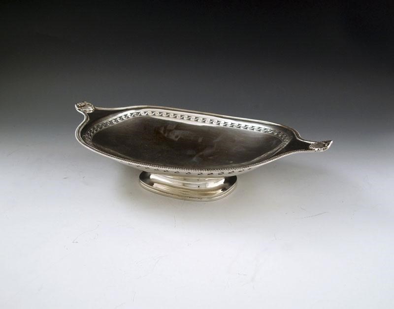 shaped rectangular form, pierced scroll frieze, shell lug handles and gadroon borders, on a shaped rectangular foot, length 32.2cm, approx. weight 14oz.