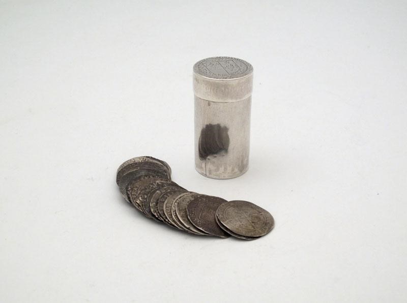 A Charles I silver counter box with twenty five silver coins,