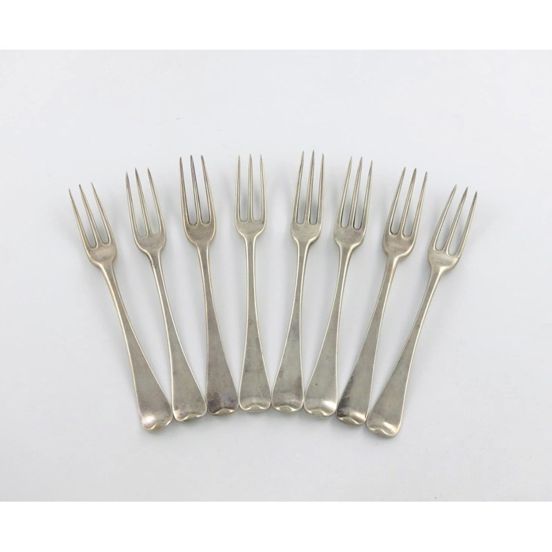 A matched set of eight Hanoverian pattern three-pronged table forks