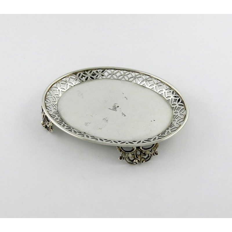 oval form, pierced scroll gallery, on four pierced foliate bracket feet, the centre with a crest, length 20.5cm, approx. weight 9.5oz.