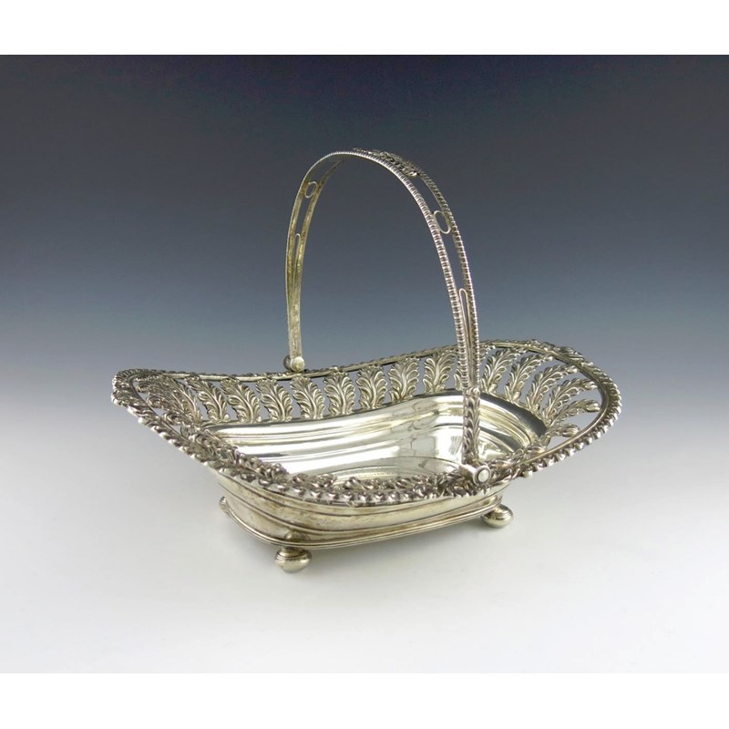rounded rectangular form, pierced acanthus leaf decoration, gadroon and shell border, pierced swing-handle, with a later inscription, on four bun feet, length 31cm, approx. weight 26.7oz. (2)