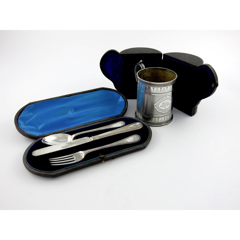 circular form, with a scroll handle, engine turned and bright-cut decoration, initialled, in a fitted case, height 9cm, plus a Victorian silver three-piece christening set, by Martin, Hall & Co, the knife Sheffield 1876, the spoon and fork London 1876, beaded borders, engraved fern leaf decoration, in a fitted case, approx. weighable 7.4oz. (2)