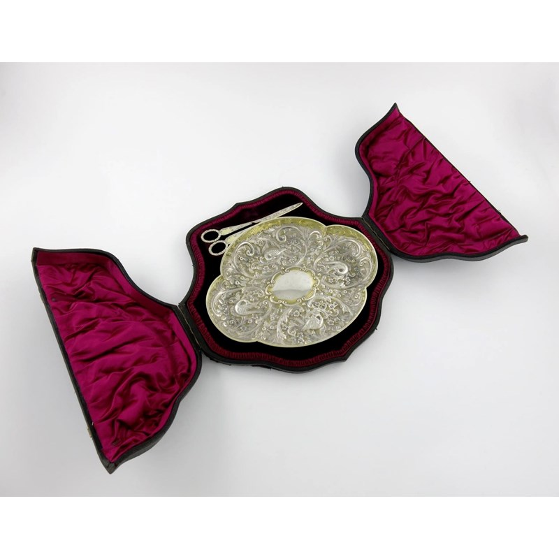 shaped oval form, embossed with birds and foliate scroll decoration, on a matted background, central vacant cartouche, in a fitted case, length 26cm, approx. weight 12oz. (2)