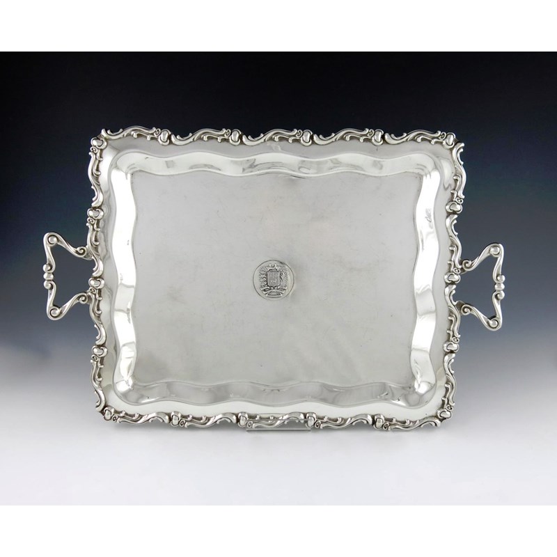 rectangular form, foliate scroll borders and handles, the centre with the coat of arms of Venezuela, length handle to handle 44.5cm, approx. weight 25.8cm.
