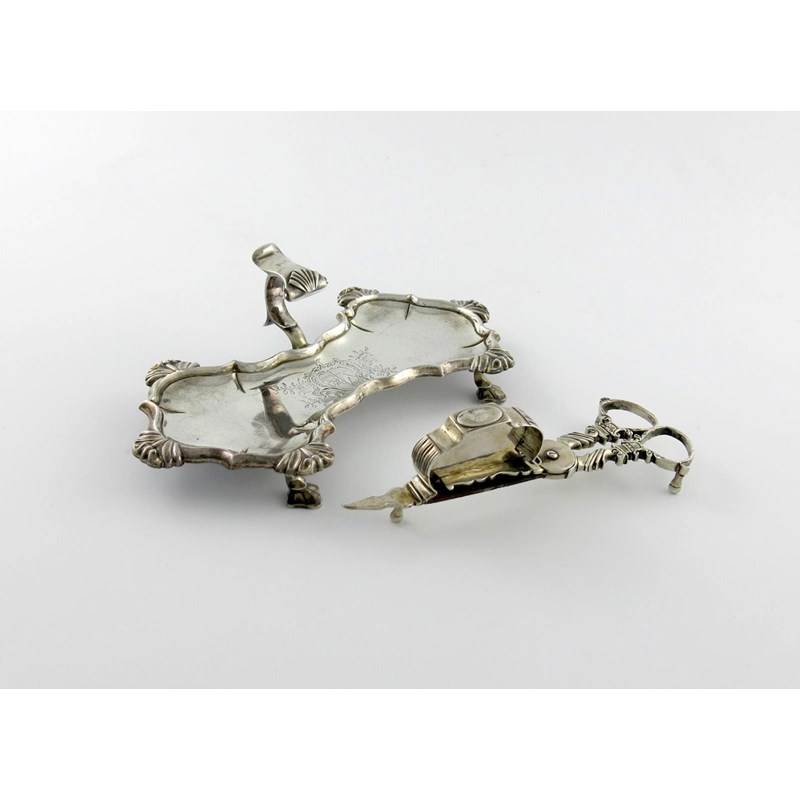 A George II silver snuffers stand with a pair of George III scissor wick trimmers
