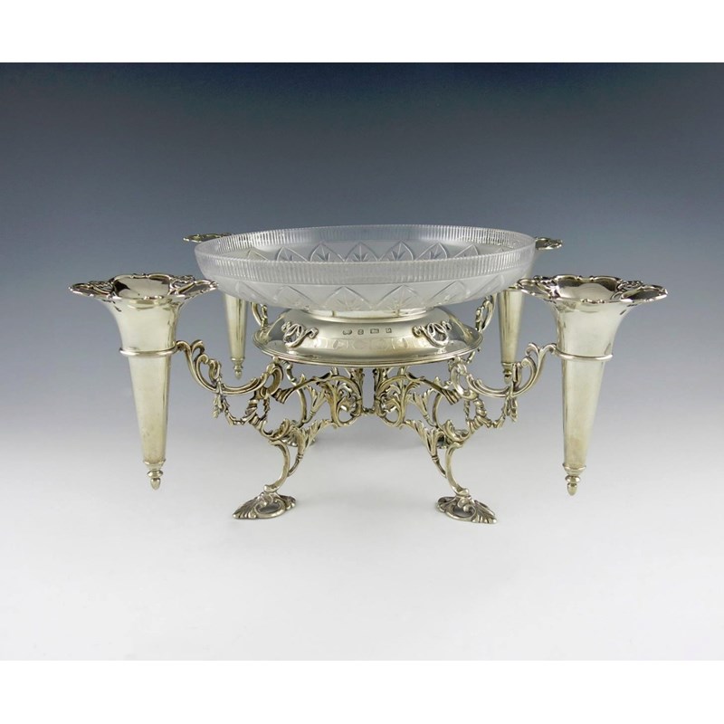 circular form, pierced decoration, with four pieced foliate scroll arms, each supporting a tapering trumpet vase, pierced border, with a central cut glass bowl, length 37cm, approx. weight 23oz.