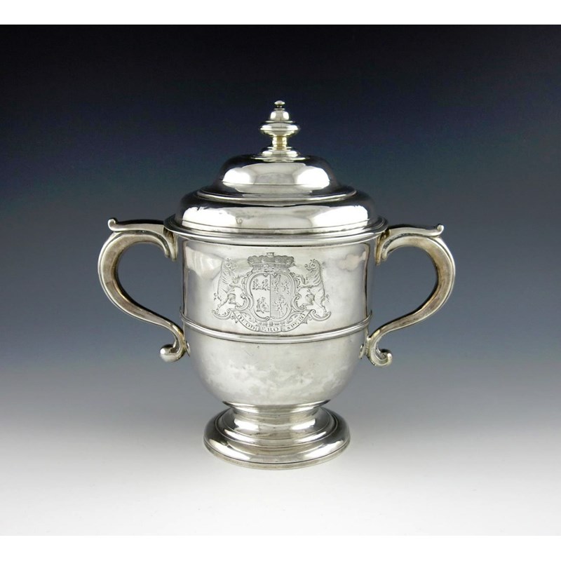 circular form, scroll handles, central girdle, the pull-off raised cover with a knop finial, on a raised circular base, patched and later engraved with the arms of Nathaniel Booth, 4th Baron Delamere of Dunham Massey, height 25cm, approx. weight 41.5oz.