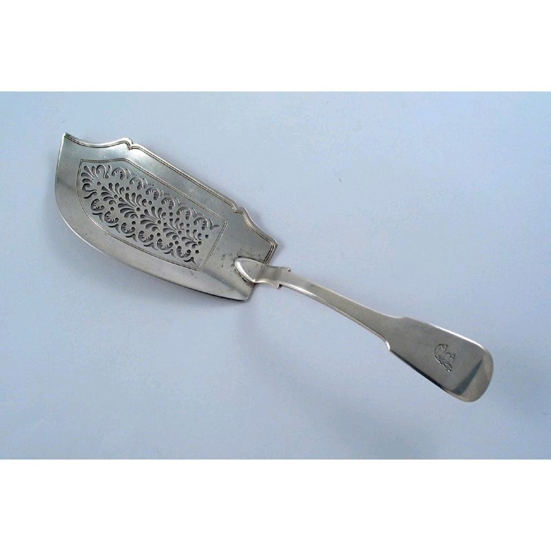 A William IV Scottish fiddle pattern fish slice, pierced with a panel of anthemian-like motifs in the blade, initialled maker's mark "W.R.", possibly by William Russell, Glasgow 1830, 5oz.