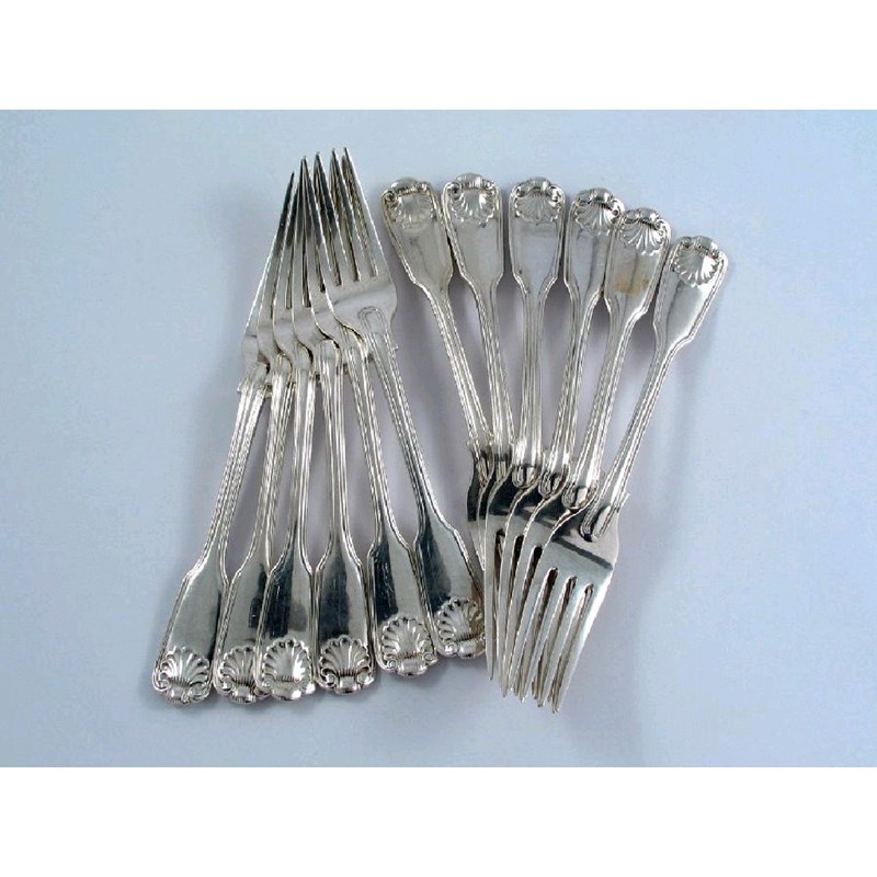 Two sets of 6 Victorian fiddle thread and shell pattern dessert forks: one set by Elizabeth Eaton, London 1850; the other set by George Adams, London 1875, 23.5oz. (12)