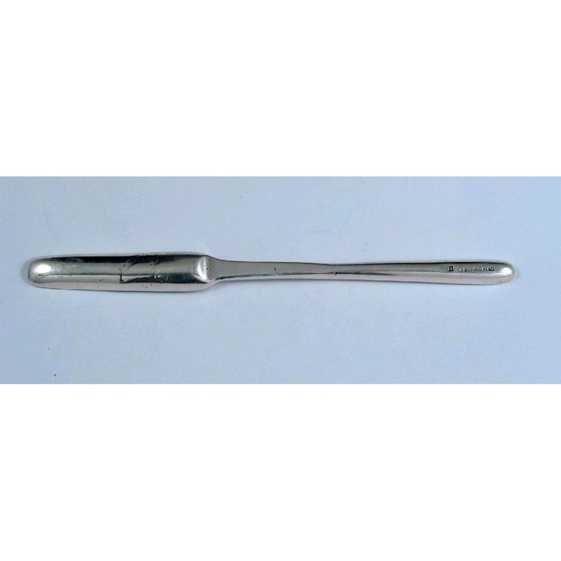 A rare George II Irish provincial marrow scoop, with one large scoop and one long channel scoop, crested, probably by George Hodder, Cork (makers mark slightly worn at one end ?GH. Sterling) c.1750, 7.7in (19.5cm) long, 1.5oz.