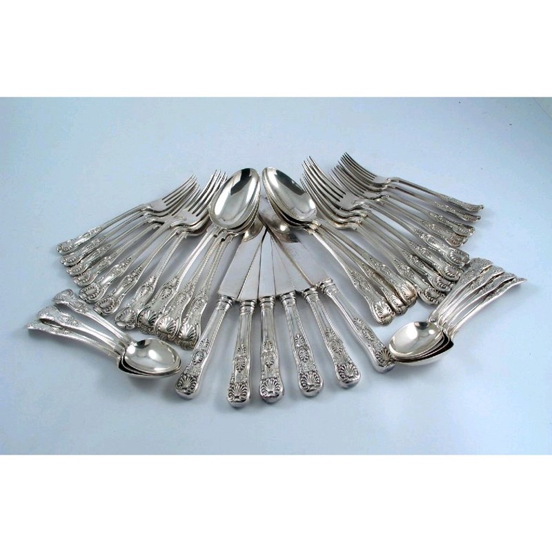 A harlequin or mixed, part canteen of Kings pattern flatware and cutlery comprising:- 6 Victorian tablespoons, 7 tableforks, 7 dessert spoons and 8 dessert forks, (the majority by George Adams) mixed maker's and dates, London 1847-1892 together with 6 non matching tableknives with steel blades by Gorham & Co. (34)