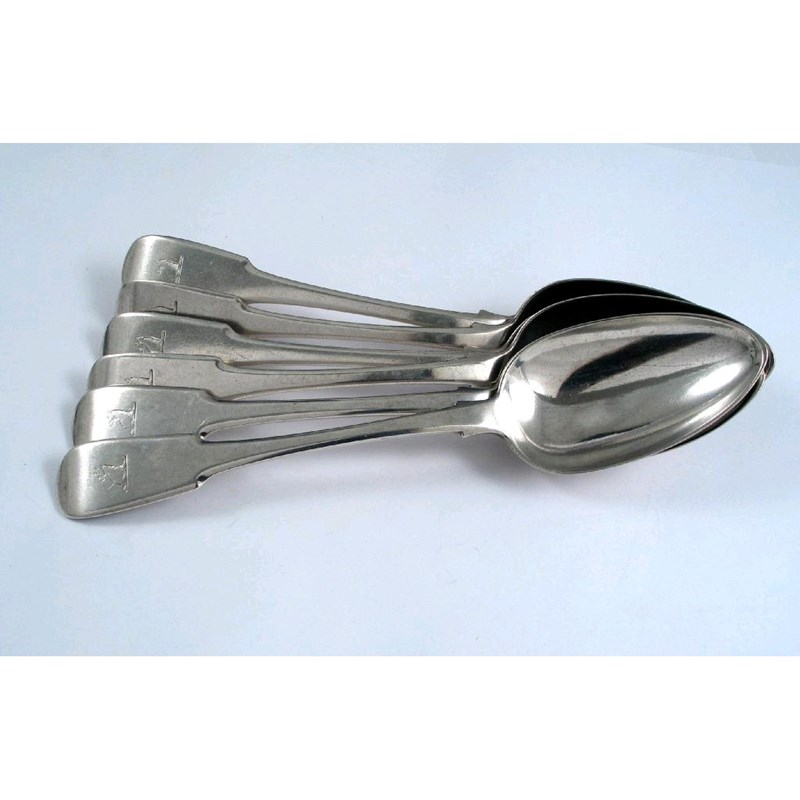 A set of six George IV Scottish provincial fiddle tabelspoons, crested by William Jamieson, Aberdeen (WJ, A.B.D, WJ) 1820-30, 14oz. (6)