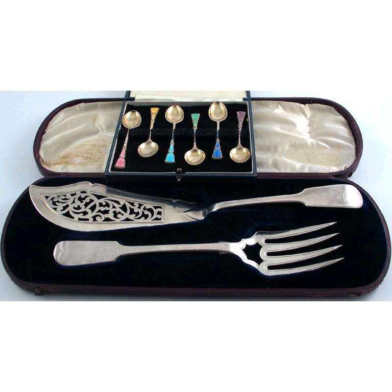A Victorian cased fish serving knife and fork, fiddle pattern, initialled, the knife by S. Hayne & D. Cater, the fork by S. Hayne, both London 1863, together with a cased set of six silver gilt enamelled coffee spoons, 9oz weighable silver. (2)