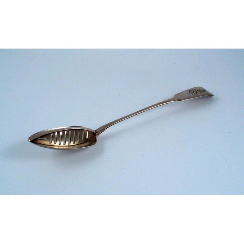 A George III Irish fiddle strainer spoon, basting size engraved with a crest and initials "RR", by S. Neville, Dublin 1812, 13in (33cm) long, 4.5oz.