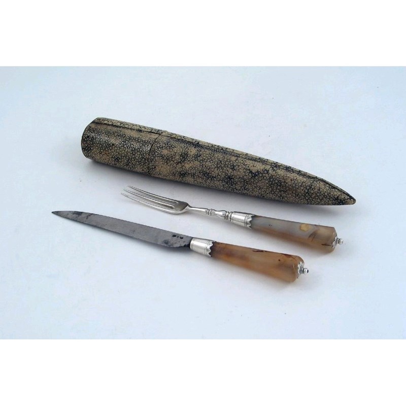 An early 18th century agate handled knife and fork, with engraved ferrules, the tapering handles and engraved end caps with ball finials, the steel knife blade with a cutlers mark, contained in a fitted shagreen case, unmarked, first third of the 18th century, the case 8.5in (21.5cm) long.