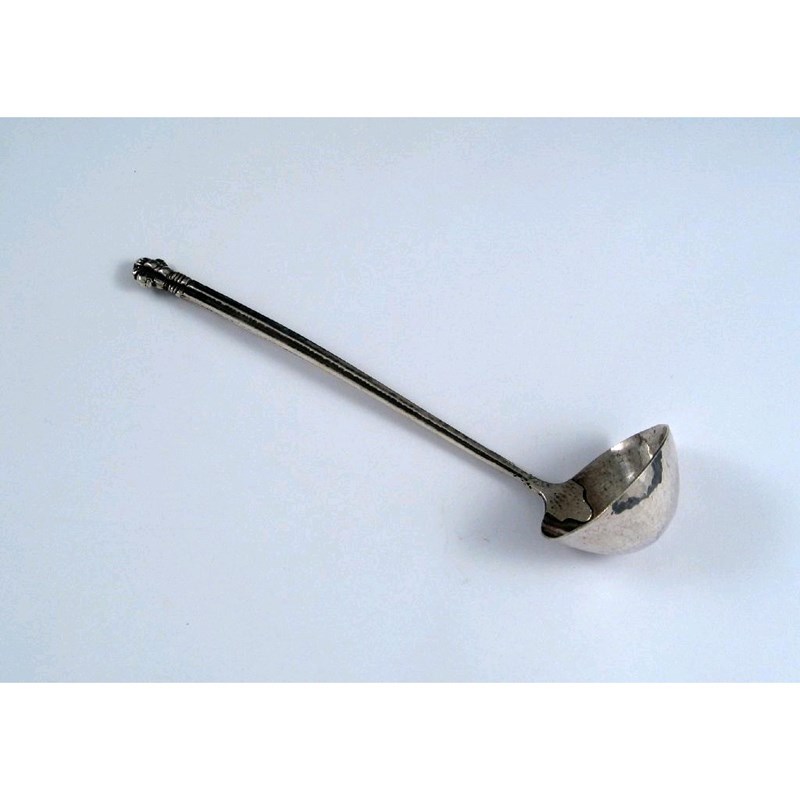By Omar Ramsden: a small ladle with a tapering stem of cruciform section, a scroll terminal and a hammered finish, London 1927, 6.75in (17.3cm) long, 1.5oz.