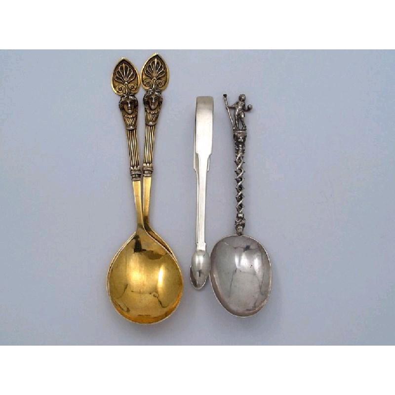 A pair of Victorian silvergilt serving spoons with cast mask decoration, a pair of Newcastle-made sugar tongs and an 18th century Dutch, figure-terminal spoon, 6.5oz. (4)