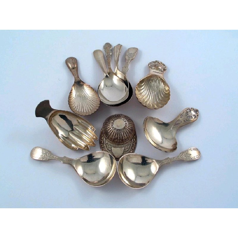 Eleven assorted modern caddy spoons, of mixed designs, dates and makers (including a jockey cap and a hand), 5.5oz. (11)