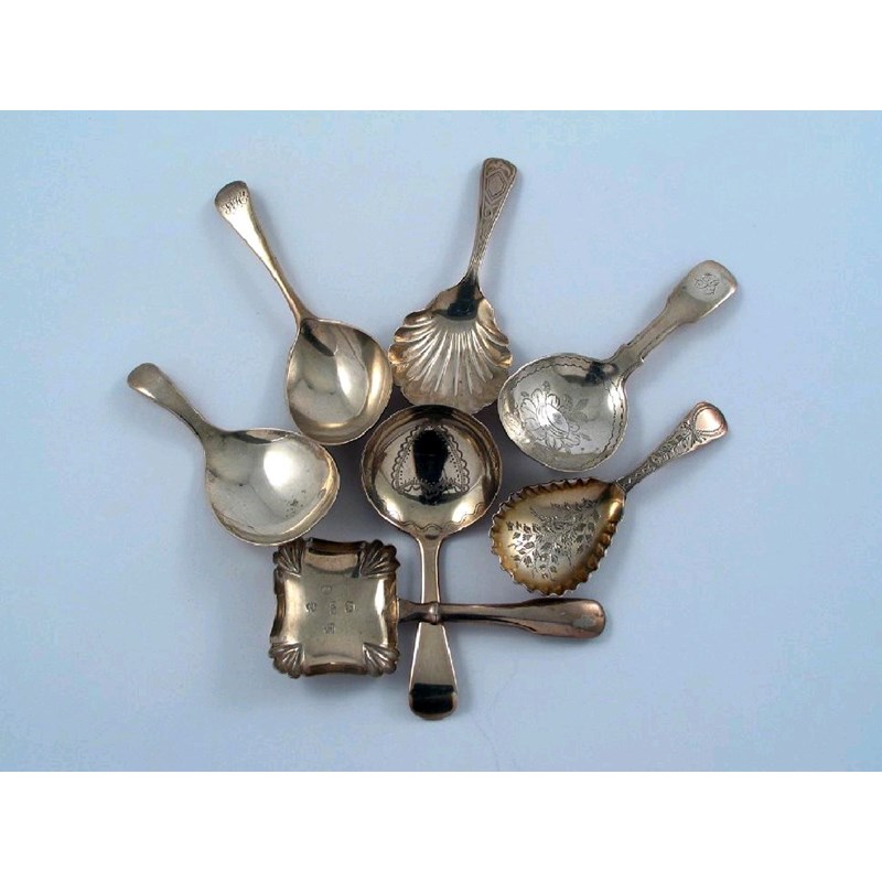Seven assorted antique caddy spoons, mixed designs, dates and makers, 2.5oz. (7)