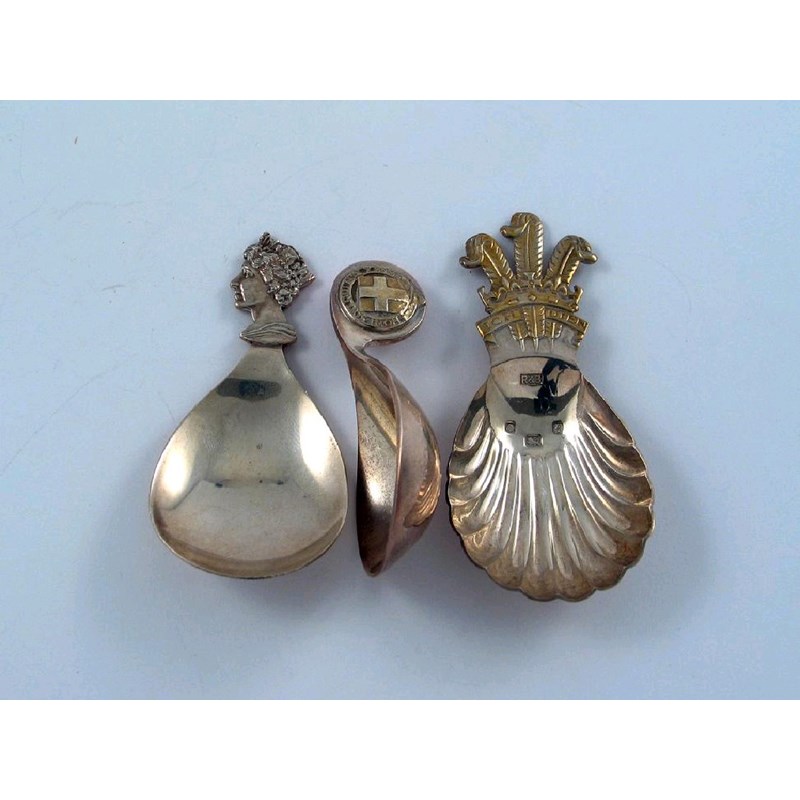 Three commemorative caddy spoons: a parcel gilt example with the Prince of Wales's feathers, by Roberts & Belk, Sheffield 1981, another with Queen Elizabeth's portrait, by A.E. Jones, Birmingham 1977 and another scoop with the Royal Garter and motto, by Garrard & Co, London 1975 (no. 17 of 500), in a fitted box, 3oz. (3)