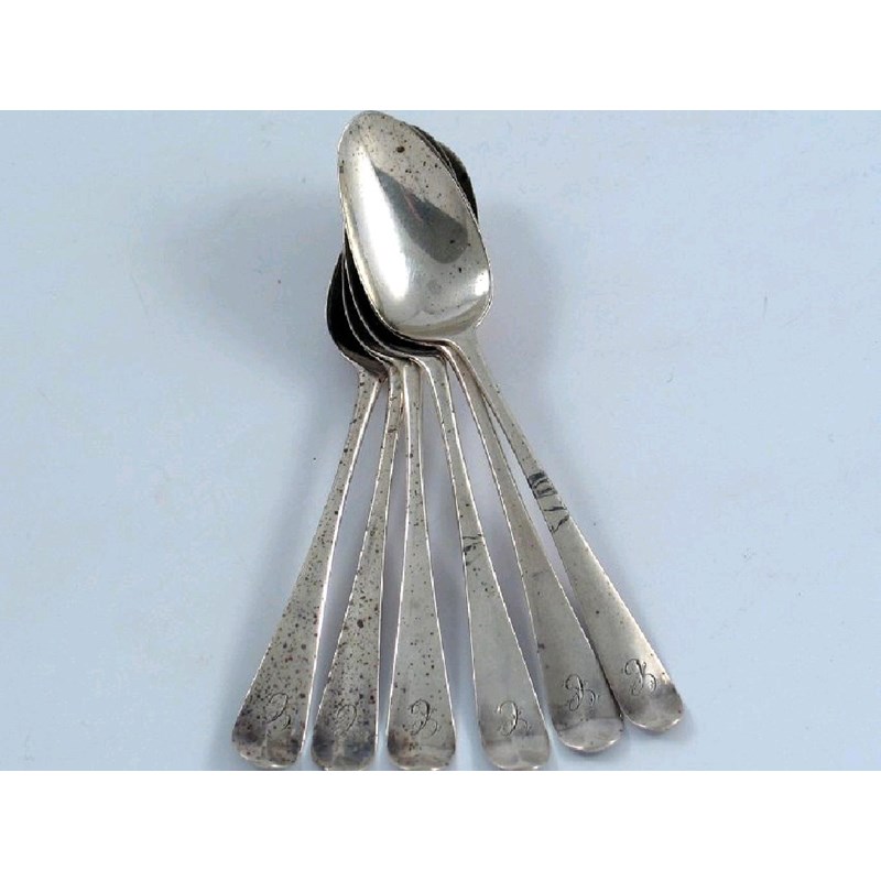 A set of six George III picture back teaspoons, with a vase of flowers below the drop, initialled "C", possibly by William Stephenson, London c.1775, 1.25oz. (6)