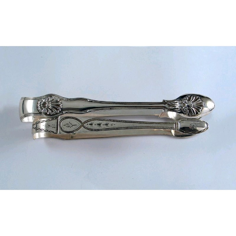 Two pairs of sugar tongs: a George III bright cut pair with bead borders, by Charles Hougham, London c.1780 and an early Victorian Kings ??? pair by William Eaton, London 1837, 3.5oz. (2)
