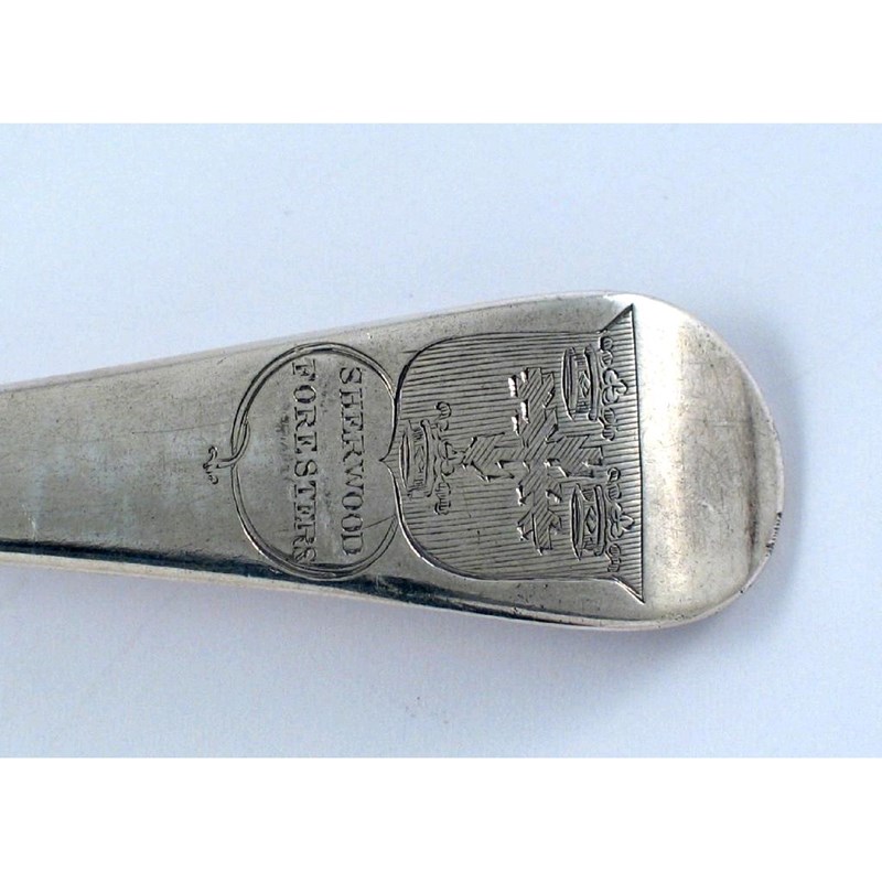 Regimental interest: a pair of George III Old English pattern tablespoons engraved with the badge of the 'Sherwood Foresters' (Nottinghamshire and Derbyshire Regiment) by Peter and Ann Bateman, London 1796, 3.5oz. (2)