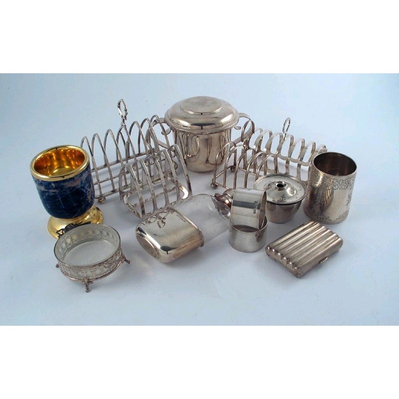 A mixed lot of modern silver including: 4 toast racks, a pair of napkin rings, a mounted glass hip flask will pull off cup, a two handled cup and cover, a pierced dish with glass liner, silver gilt mounted hard stone cup, and the following antique items: a spirit burner (from a kettle), an engraved mug and a filtered cheroot case, mixed makers and dates, 38oz weighable silver.