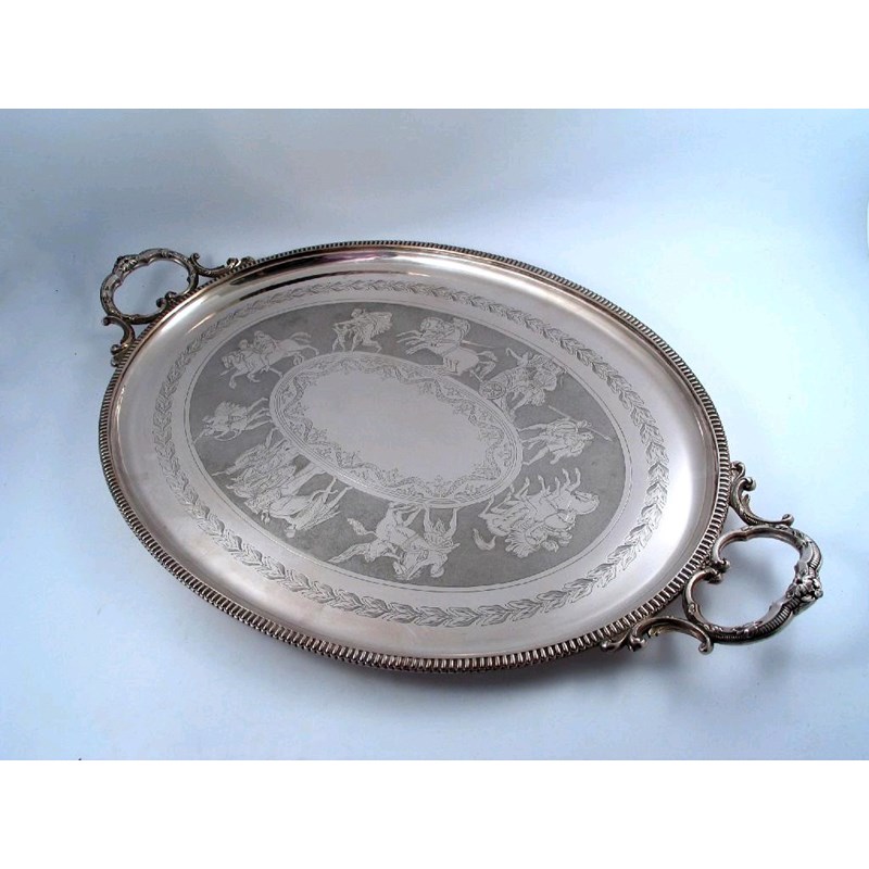 A Victorian plated oval tray, with gadrooned border, engraved around the centre with a frieze of classical figures on a matte ground, bordered, by repeating foliate drops, unmarked, c.1870, 30.5in (77.5cm) wide.