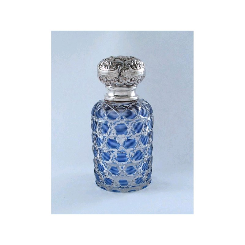 An Edwardian mounted toilet water bottle, flashed with blue linear decoration, embossed hinged cover, Birmingham 1906, 5.3in (13.5cm).