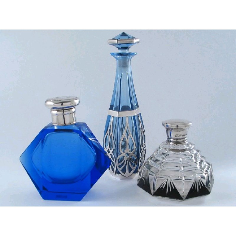 Three Art Deco mounted coloured glass scent bottles. (3)