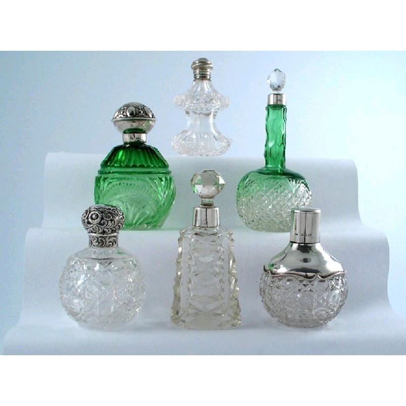 Four assorted clear glass and three coloured glass mounted scent bottles. (7)
