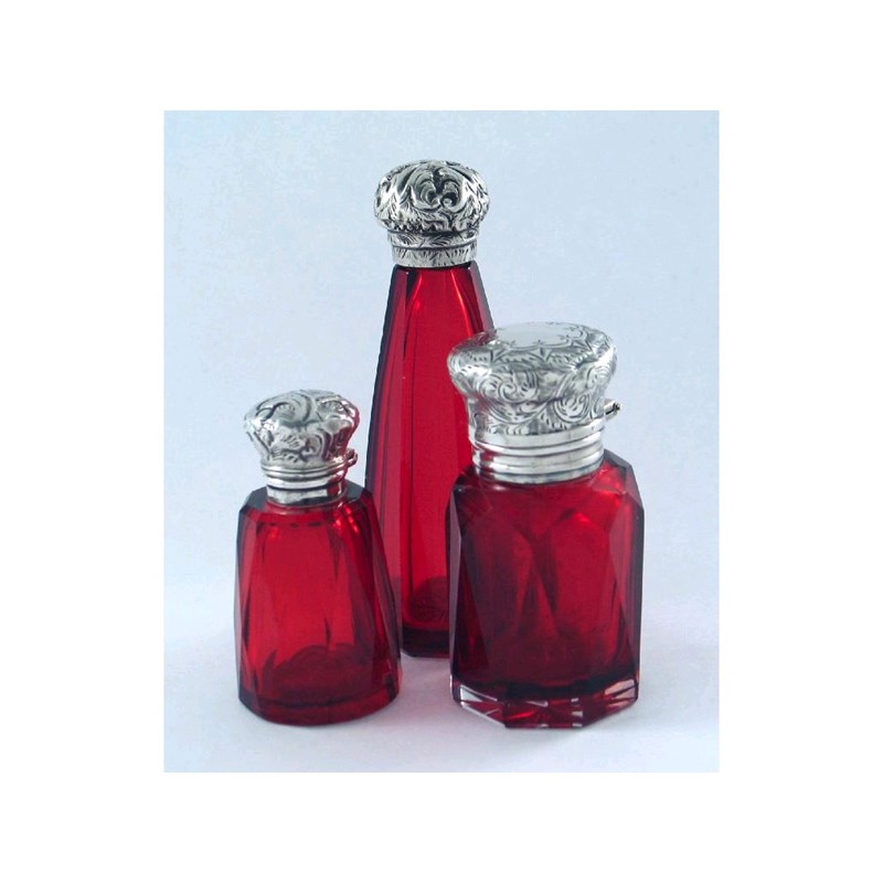 Three assorted Victorian mounted cranberry glass scent bottles, with faceted bodies. (3)