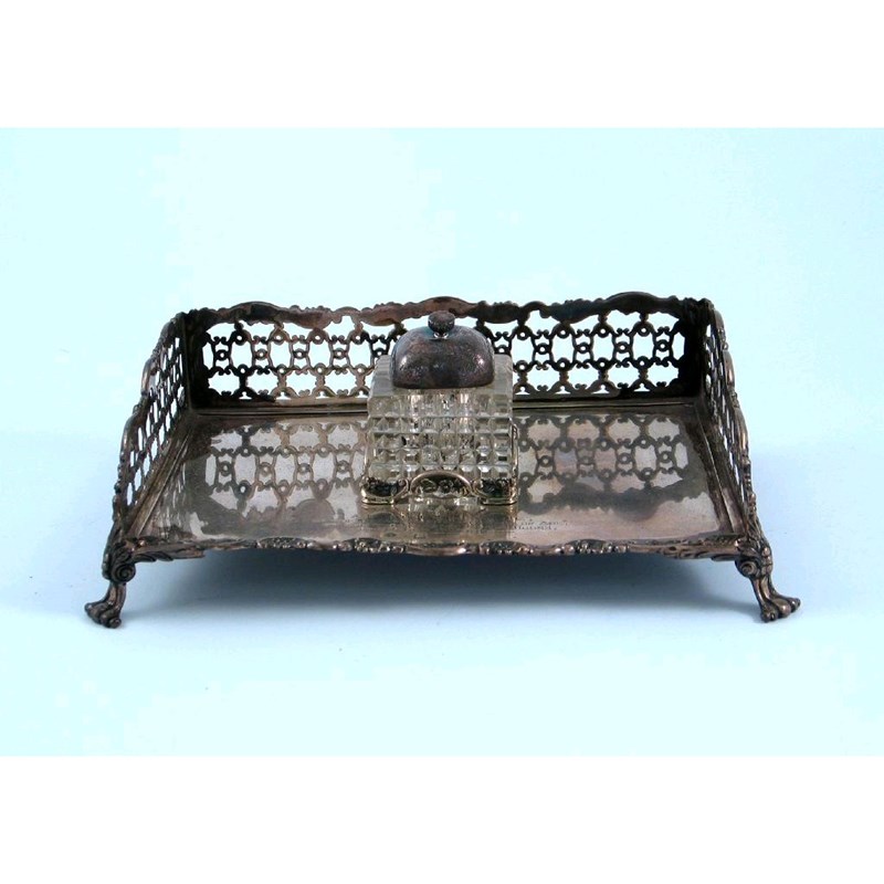 A late Victorian gallery inkstand, with a cut glass ink bottle (lacking cover), inscribed, by Edward Hutton 1893, 8in (20cm) wide, 14oz weighable silver.