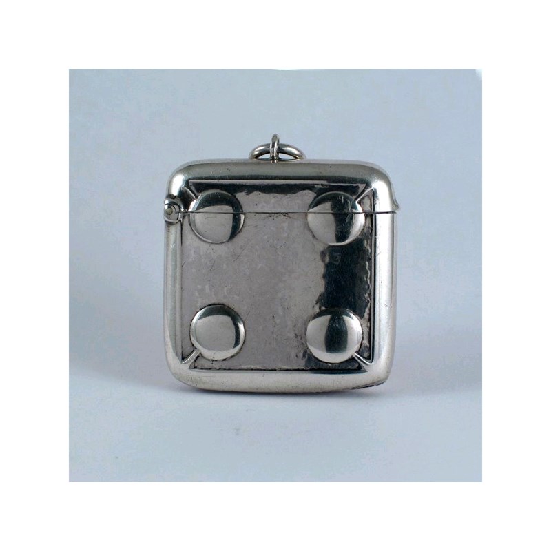 An Edwardian Arts & Crafts vesta case, square with a raised rounded in each corner and a ring attachment probably by W.H. Leather, Birmingham 1905, 1.8in (4.5cm) high, 1oz.