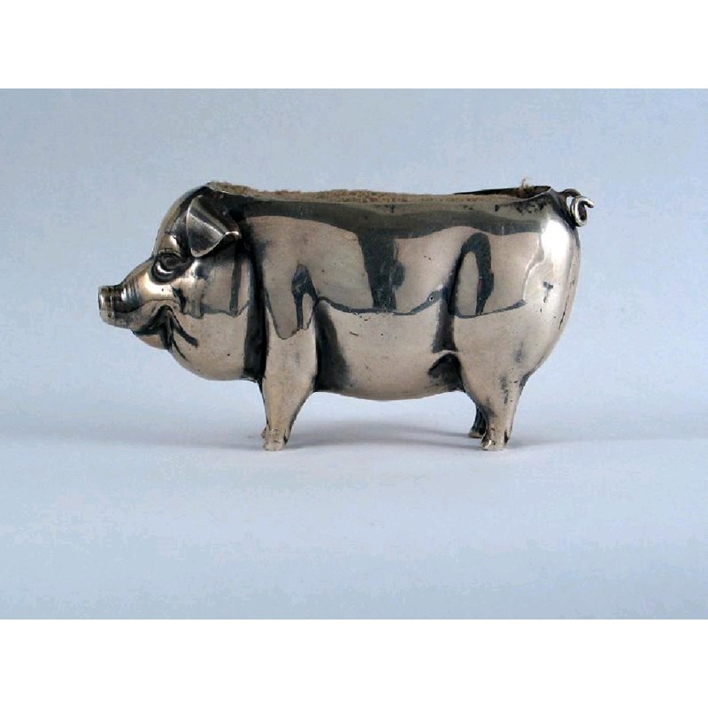 An Edwardian novelty pin cushion in the form of a standing pig, maker's mark of H. Matthews overstriking another, Birmingham 1906 (loaded), 3.5in (9cm) long.