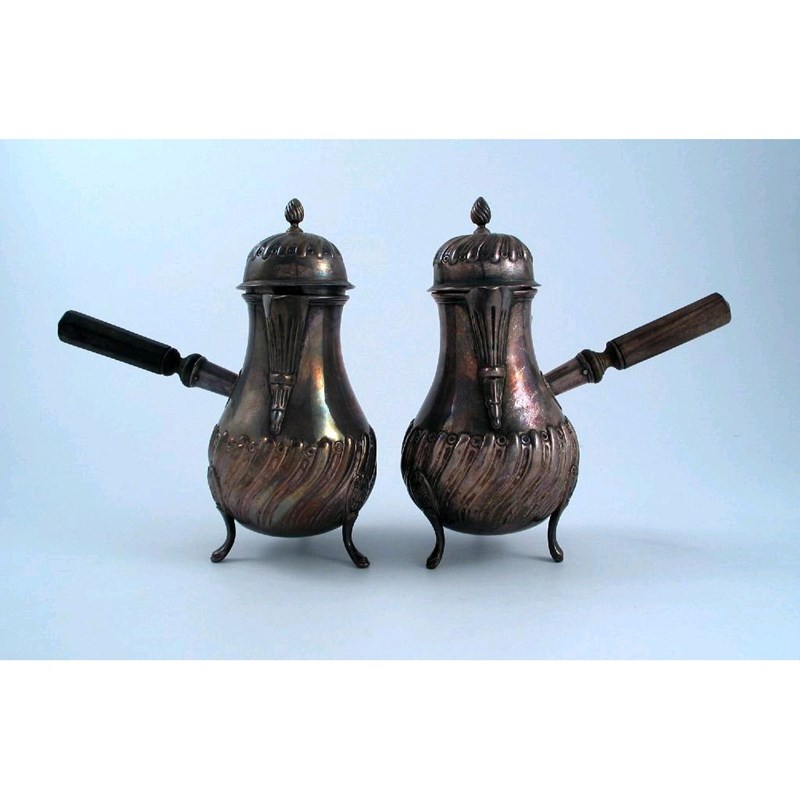 A pair of late Victorian cafe au lait pots, with pear-shaped bodies and part, wrythen fluted decoration, wooden handles, by Joseph Harper, London 1886, 20oz. (2)