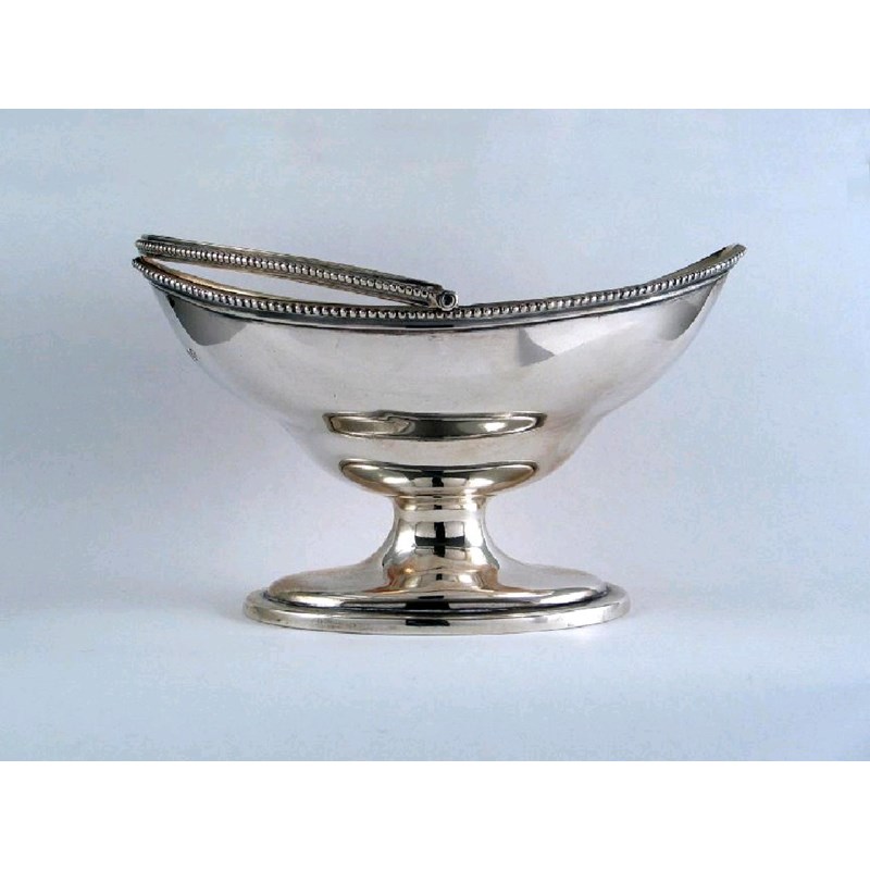 A Victorian swing handled sugar basket, with bead borders and an oval pedestal foot, by T. Bradbury & J. Henderson, London 1881, 5.5in (14cm) wide, 4.25oz.