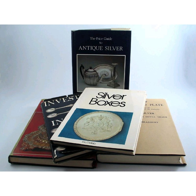 Five assorted volumes of silver and plated wares, Waldron's price guide to antique silver, Clayton's dictionary of silver and gold, Delieb's investing in silver & silver boxes and Bradbury's History of Old Sheffield plate. (5)