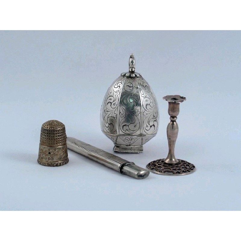 A small mixed lot: a late Victorian miniature or toy candlestick with a pierced base, by William Comyns, London 1891, 1.6in (3.8cm) high, together with a decorative thimble by Charles Horner, Chester 1910; a continental moustache comb in a travelling case, and an engraved container probably for beetle nuts. (4)