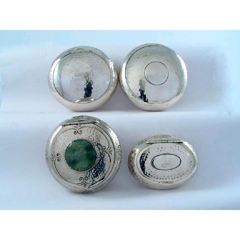 Three Edwardian, Birmingham made examples, with spot hammered finishes, and a continental example set with a mottled green stove on the cover, 10oz. (4)