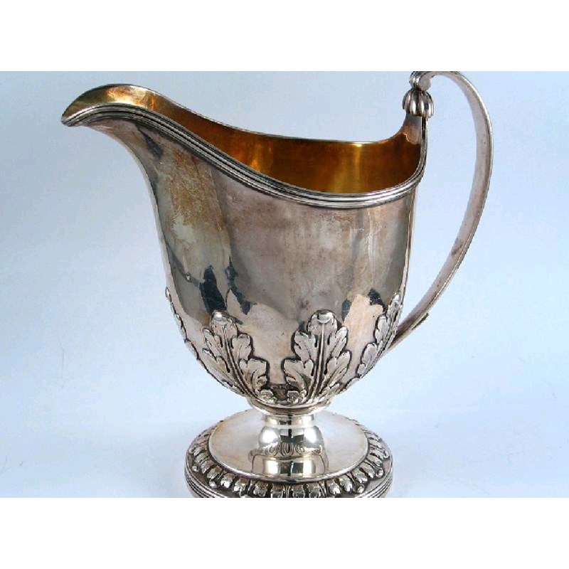 A George III large helmet cream jug, on a circular pedestal foot with a loop handle, decorated with a calyx of stiff leaves around the lower body and leaves around the foot, gilt interior, Peter Podio London 1800, 5.6in (14.2cm), 9.4oz.