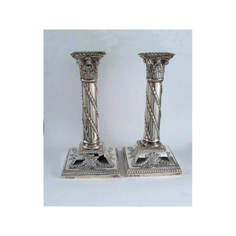 A pair of late Victorian candlesticks, with bevelled squares embossed with paterae and festoons of foliage and garlands around the columns, by Hawkesworth Eyre & Co, Sheffield 1900 (loaded), 7.5in (19cm) high. (2)